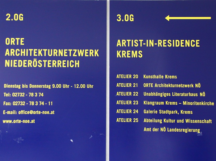 ORTE Architekturnetzwerk Niederösterreich ist Projektpartner dieses Programms und vergibt an Architekt:innen, Raumplaner:innen, Landschaftsarchitekt:innen, Designer:innen, Theoretiker:innen, Kurator:innen sowie Künstler:innen mit dem Schwerpunkt Architektur eine Atelierwohnung in Krems samt einem Stipendium, das vom Land Niederösterreich finanziert wird. Eine Jury wählt jährlich jene Artists in Residence aus, die dann fünf oder elf Wochen in Krems tätig sind.