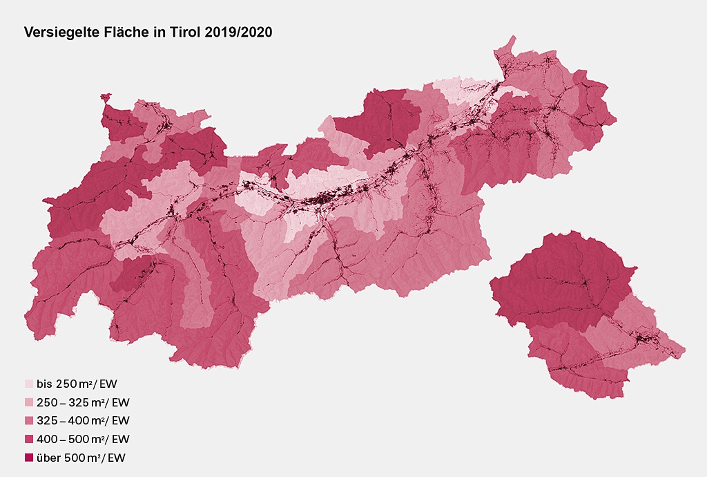 Nach einer auf Basis von Gebäudeerhebungen, Landnutzungsinformationen der digitalen Katastralmappe und Satellitenbildern durchgeführten Erhebung kann für den Zeitraum 2018 – 2020 ein Gesamtausmaß von ca. 215 – 225 km2 an versiegelten Flächen in Tirol geschätzt werden, wobei hiervon etwa die Hälfte auf Verkehrsflächen entfällt und ein Drittel auf mit Gebäuden überbaute Flächen. Der Rest betrifft sonstige versiegelte Flächen (z. B. Lager- und Manipulationsflächen). Die gesamte versiegelte Fläche Tirols entspricht etwa 1,75 % der Landesfläche, wobei 95 % der versiegelten Flächen innerhalb des Dauersiedlungsraums liegen, wo sie einen Anteil von knapp 14 % ausmachen.