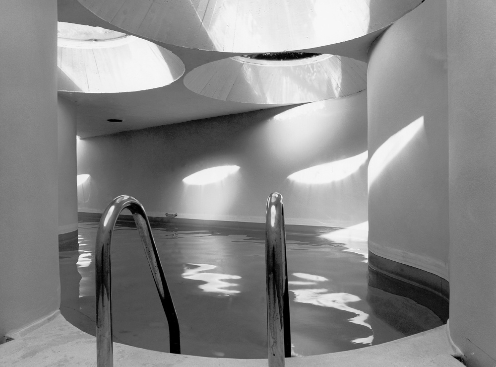 Wer weiß, in welcher Jahreszeit Josef Lackner diesen Auftrag entwickelt hat. Ich vermute fast in der unwirtlichen Winterzeit. Sein Text zum Projekt1, der wie das Bad selbst, durch seine poetische Beschreibung der Licht- und Jahreszeitenverhältnisse eine Sonderstellung in seinen Projekttexten einnimmt, reflektiert auf Höhenlage und Klima, die Art des Schwimmens und das Licht, sogar auf Sonne und Mond, Baumkronen und Farben des Himmels, aber kein Wort zur Konstruktion. Neben dem bürgerlichen, orthogonal eingeteilten, villenartigen Haus, in dem ganz oben unter Dach, nach Süden blickend, der groß gewachsene, ganz und gar nicht sportliche Paul Flora seine „Striche strichelte", entstand – skizziert aus Lackners „Pranke“ – dieses „wellige“ Gebilde im verwilderten Garten.