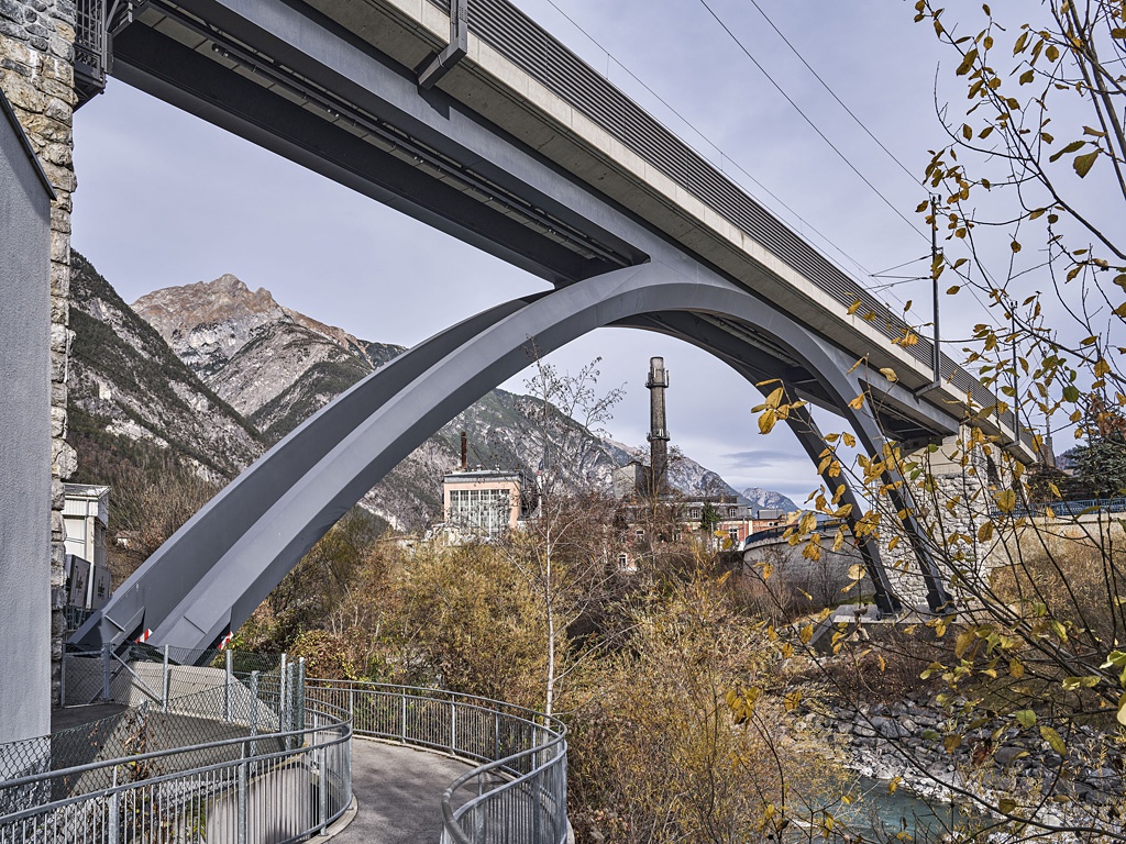 Beginnt man diesen Transformationsprozess weiter zu denken, dann kann man die großen Flächen der Kaserne nicht aussparen. Welches Potenzial könnte geweckt werden, wenn ein Teil dieser exklusiven Fläche den Menschen zur Verfügung stehen würde? Dieses Gedankenexperiment kann man in Landeck an einer weiteren Stelle fortsetzen. Denn eine ähnliche Chance bezüglich Stadtentwicklung hat in Landeck das Areal der Donau-Chemie parallel zu den Gleisen der Arlbergbahn zwischen Bahnhof und Malserstraße, begrenzt durch die beiden Flüsse. Mitten in der Stadt steht eine Fabrik wie sie von Kindern gezeichnet wird, mit Schloten, Hallen, Gebäuden, Silos und Förderbändern. Für einen nicht Ortskundigen stellt sich die Frage – was wird hier produziert, was an einer anderen Stelle nicht produziert werden könnte? Ähnlich wie es in Tirol Textilfabriken, Röhrenwerke etc. in Stadtnähe gab, hat Landeck seit 1901 eine Karbidfabrik auf einem knapp 8 ha großen Gelände in bester Lage, mit derzeit ca. 40 Mitarbeiter*innen.