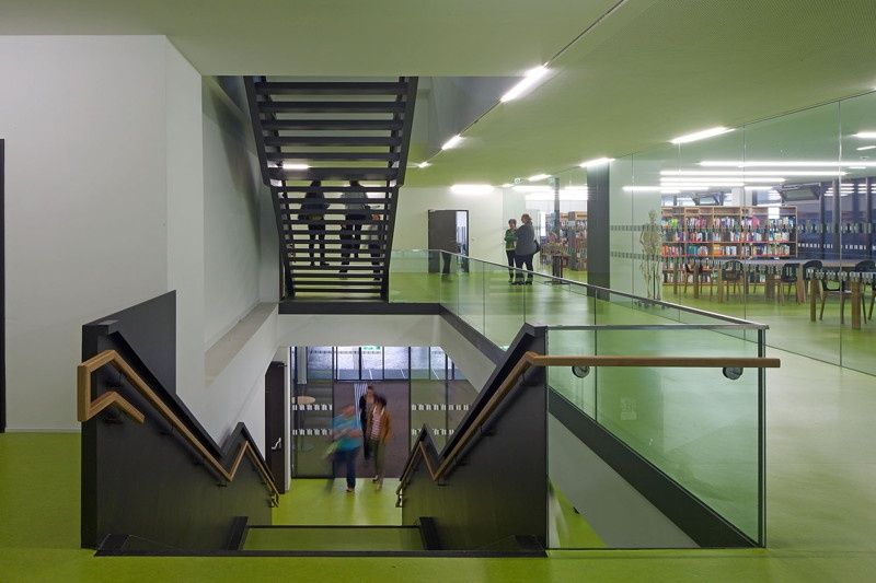 Im aufgestockten 2. Obergeschoss wurde u. a. ein großer und entsprechend hoher Hörsaal untergebracht, die unterschiedlichen Raumhöhen dieser Ebene sind Ausgangspunkt einer modellierten, begrünten und begehbaren Dachlandschaft.