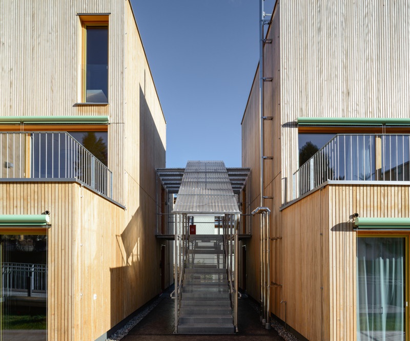 Die zweite Station der „Vor Ort“-Gespräche liegt etwas höher in der Kaspar-Weyrer-Straße, nördlich vom Friedhof Mariahilf. Die kleine, von Werner Burtscher und Patrick Lüth geplante Wohnanlage ist aus einem geladenen Wettbewerb hervorgegangen, den die Diözese Innsbruck 2013 auslobte. Ausgehend von der ursprünglichen Bebauung des Gebiets oberhalb der Geländekante zur Höttinger Au lag die Intention der Architekten darin, keinen „Superblock“ zu errichten, sondern das Volumen auf mehrere, differenziert gestaltete Baukörper mit vorgelagerten Grünräumen aufzuteilen.