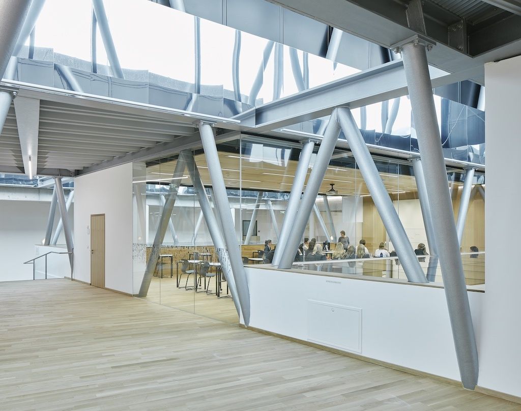 Das Siegerprojekt von Johannes Wiesflecker besteht in einer statisch eigenständigen Ergänzung im zweiten Obergeschoss, mit der der L-förmige Bestand zu einem Hoftypus weiterentwickelt wird und gleichzeitig der Baukörper zu einer neuen Großform vereinfacht wird. Über die verschieden hohen Gebäudeteile ist eine horizontale Trägerkonstruktion gelegt, die eine neue Halle, fehlende Klassenräume und in die Mitte „eingehängte“, indirekt beleuchtete EDV-Räume beinhaltet. Die statisch entwickelte Trägerstruktur bildet zugleich auch die Raumstruktur – das Tragwerk wird zum begehbaren Panoramageschoss. Eine neue Eingangssituation bereichert das Erdgeschoss, das als „Gastronomiegeschoss“ belassen wird, im ersten Obergeschoss wird die Verwaltung konzentriert. Indem der Bestand fast unangetastet bleibt, kann der gesamte Umbau während des laufenden Schulbetriebs erfolgen.