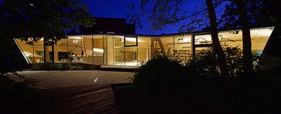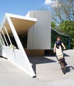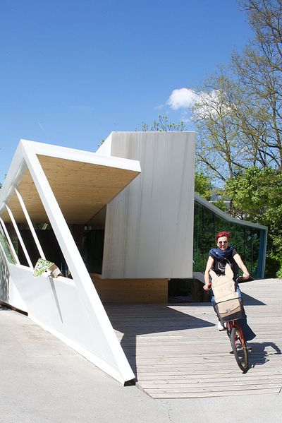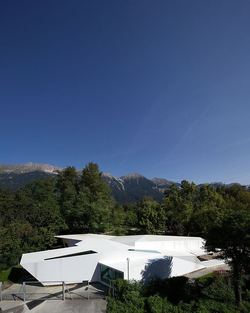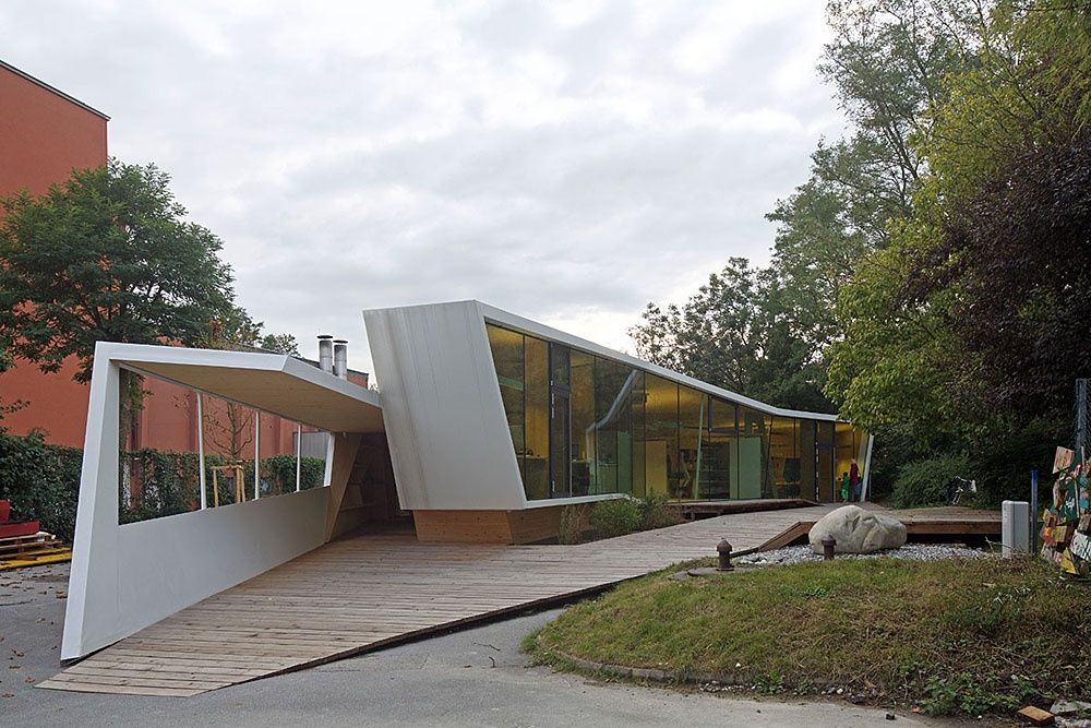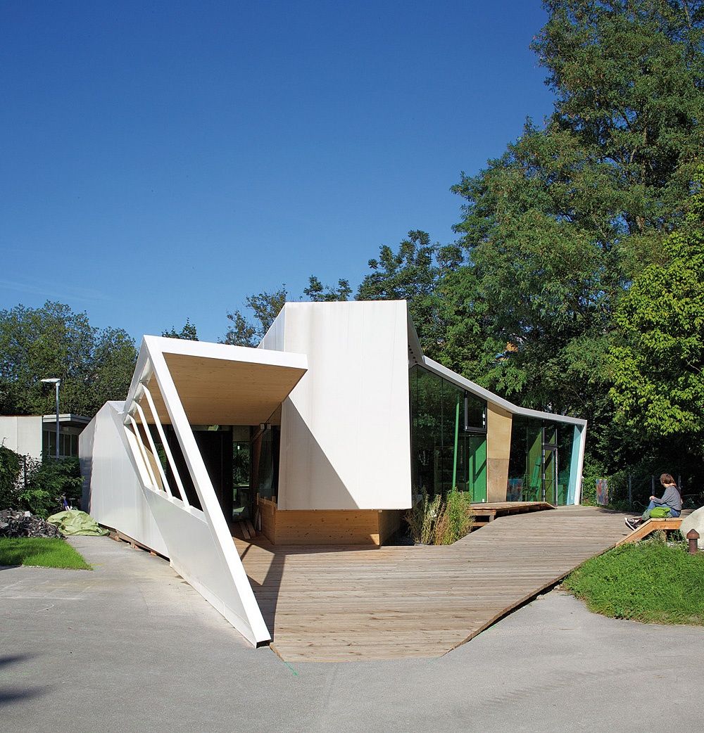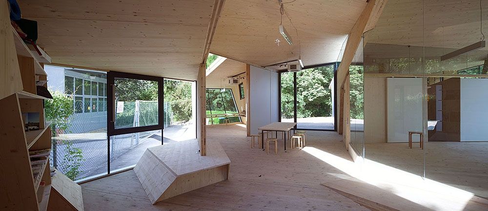 Entstanden ist ein pavillonartiges Werkstättengebäude, das nicht nur den Kindern und Jugendlichen als NutzerInnen ein optimales Raumangebot bietet, sondern auch den Park durch seine einzigartige Architektur bereichert. Vorgelagerte Terrassen und raumhohe Glasfronten verbinden den geschwungenen Baukörper mit der Umgebung, im Inneren bilden schräge Böden und Wände ein fließendes Kontinuum an Räumen mit unterschiedlichen Atmosphären und Arbeitsmöglichkeiten.
