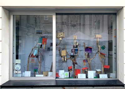 Ausstellung der Primaria1 der SIP (Schule im Pfeifferhof): Eine Schule am Stadtrand von Graz, umgeben von Bäumen. In diesem täglichen Lernumfeld entstand als kreativer Abschluss des Schulprojektes „Messen – Orientieren – Planen“ ein ganzes Dorf mit 20 unterschiedlichsten Traumbaumhäusern. Aus einer Fülle unterschiedlichster gesammelter Recycling-Materialien bastelten die Kinder Modelle, die – zusammen mit Zeichnungen und Texten – im Schaufenster des HDA zu sehen sind.