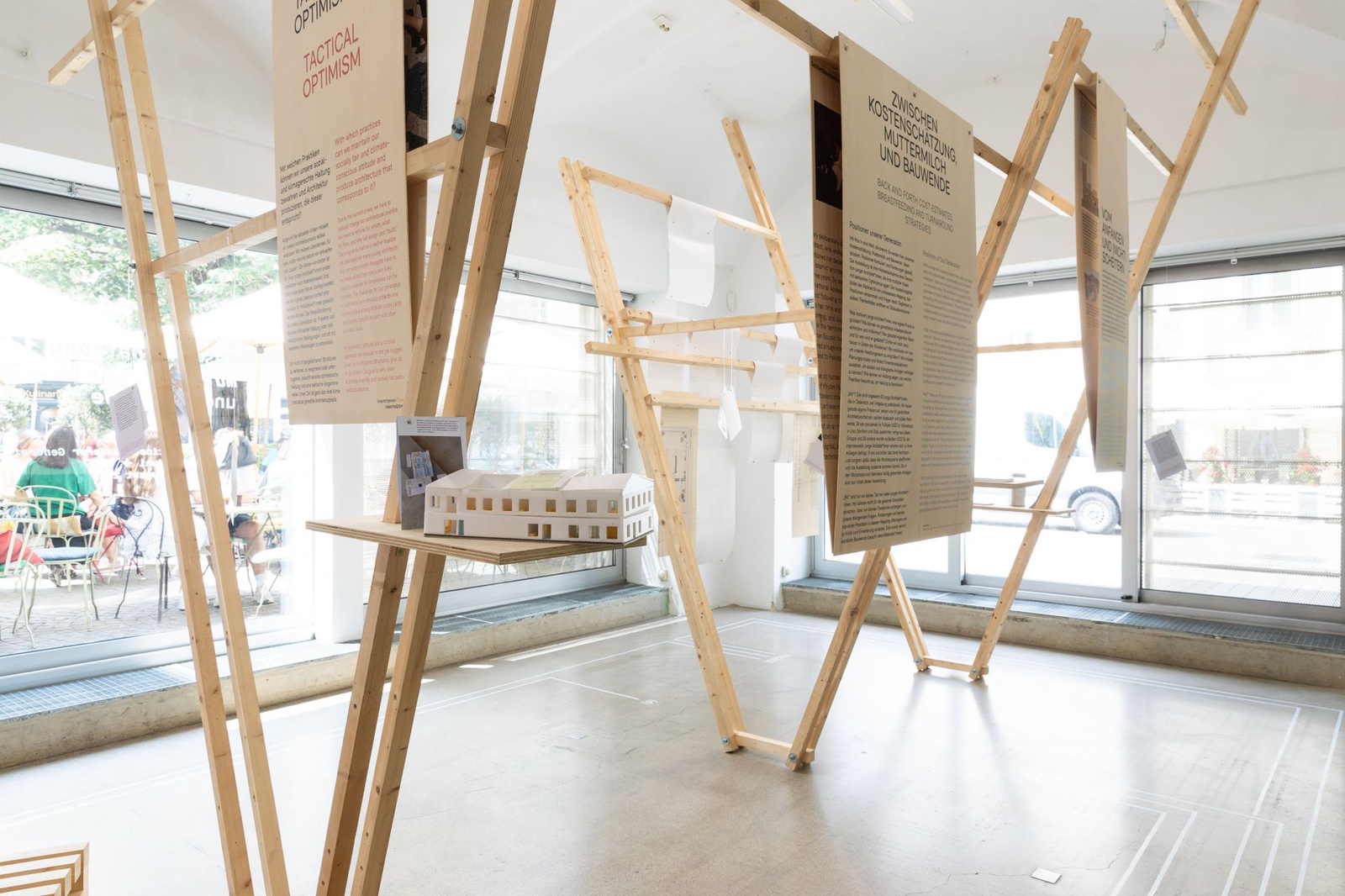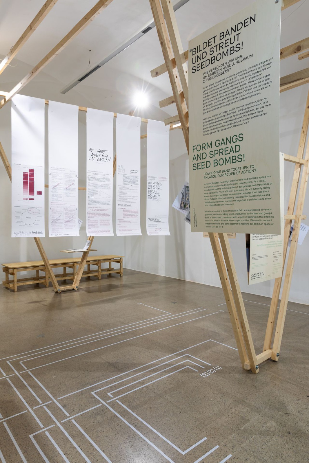 AusstellungDie Ausstellung „Zwischen Kostenschätzung, Muttermilch und Bauwende“ versammelt die drängendsten Fragen, Positionen und Forderungen junger Architekt:innen in Österreich. Die Herausforderungen sind groß: die Bauwende aktiv mitgestalten, gerechtere Arbeitsstrukturen schaffen und die eigenen Handlungsspielräume durch veränderte Rahmenbedingungen vergrößern. Gezeigt wird ein kollektiv kuratiertes Mapping, das gemeinsam mit 60 Architekt:innen erarbeitet wurde und den Auftakt zu einer offenen Diskussion bildet. Die Installation lädt zum Austausch ein, stellt Fragen und soll durch Kommentare der Besucher:innen weiter wachsen.