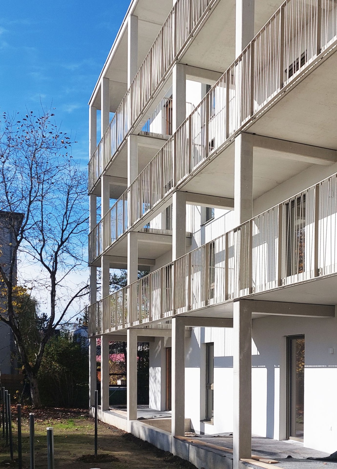 Die Wohnbebauung, eine Gruppierung von fünf Punkthäusern mit verschiedenen Höhen, reagiert städtebaulich auf die umgebende Bebauungsstruktur, die vorwiegend aus Einzelobjekten unterschiedlicher Größen und Höhen besteht. Es entsteht ein vielschichtiges Außenraumangebot mit differenzierten Übergängen von öffentlichen zu halböffentlichen und privaten Freibereichen.