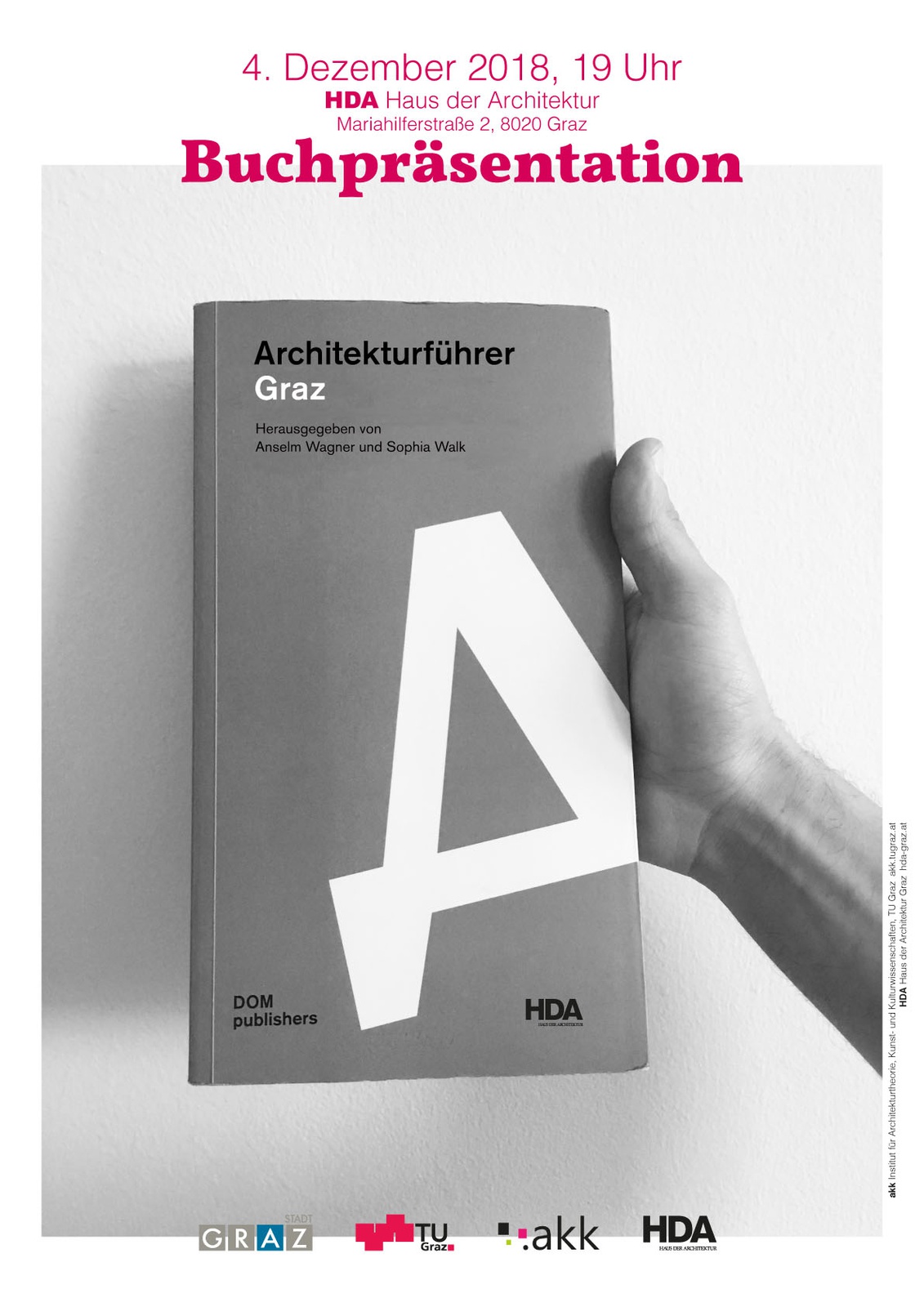 Der Architekturführer Graz, den Anselm Wagner und Sophia Walk in Zusammenarbeit mit dem Haus der Architektur (HDA) herausgeben, will nicht nur die Lücke seit Erscheinen des letzten Grazer Architekturführers vor zehn Jahren füllen, sondern stellt erstmalig alle Epochen der Grazer Baugeschichte vom Mittelalter bis heute in ihrer Gesamtheit dar. Ziel ist es, insbesondere das Neben- und Ineinander von Alt und Neu zu zeigen, das gerade auch für die UNESCO-Welterbezone der Grazer Altstadt so charakteristisch ist und die Stadt davor bewahrt, zu einem historischen Freilichtmuseum zu werden. Elf Touren führen durch die Altstadt, die Gründerzeitviertel und die äußeren Bezirke der ehemaligen Vororte.