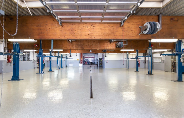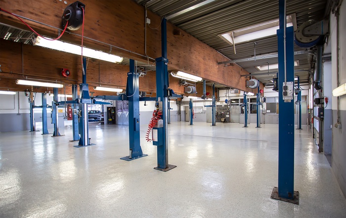 Die neue Bodenbeschichtung ist hoch mechanisch und chemisch belastbar und eignet sich damit hervorragend für einen begeh- und befahrbaren Werkstattboden. Die Beschichtung weist eine geschlossene Oberfläche auf, die leicht zu reinigen und trittsicher ist. Bei der optischen Gestaltung entschied sich der Bauherr für ein freundlich wirkendes Kieselgrau mit Einstreuchips in Schwarz und Weiß.