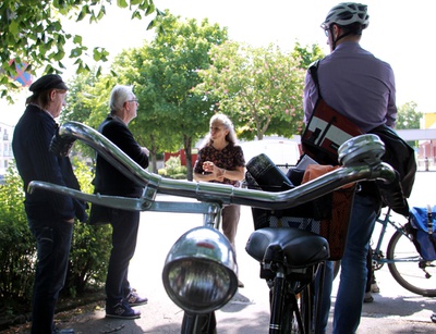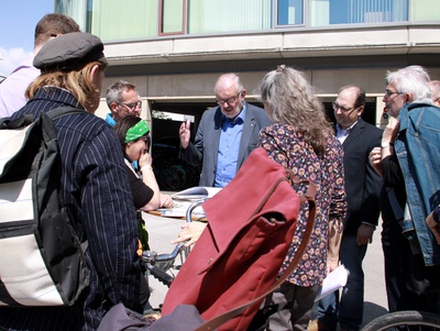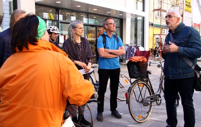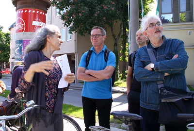 Auf dem Rücken des eigenen Drahtesels begab man sich unter der Leitung von Architekturhistorikerin Maria Welzig auf eine 5 km lange Spurensuche zu einem bunten Mix wegweisender Bauten ab 1900, die das Stadtbild St. Pöltens in sehr unterschiedlicher Weise zum Teil heute noch prägen. Museumsleiter Thomas Pulle vom Stadtmuseum wusste in mitreißend vorgetragenen Ergänzungen, die historische Hintergründe auszuleuchten, nicht auf den ersten Blick ersichtliche Bezüge zum Hier und Jetzt in St. Pölten zu unterstreichen. Bauphysiker Peter Holzer oblag der Part, anhand der vorgestellten Gebäude zu verdeutlichen, wie herausfordernd die Aufgabe ist, Gebautes, das nicht ursprünglich in Passivhausqualität konzipiert war, klimafit für die Zukunft zu machen.