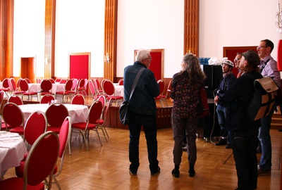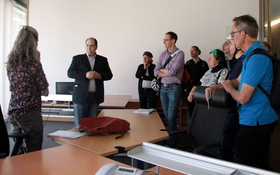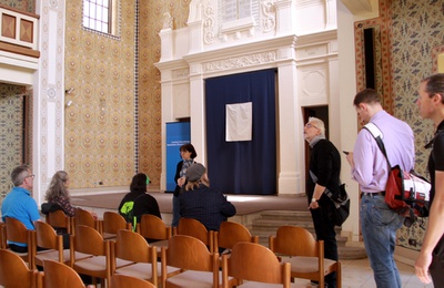 Eine Jugendstilikone unweit des Bahnhofs bot Gelegenheit zu erfahren, wie man bei einem Gebäude zum Einsatz gebrachte Gläser aufgrund ihrer Erscheinungsform historisch richtig zuordnet. Entdeckt wurde das in den Komplex eines hochmodernen Hotels integrierte, verborgene Juwel des ehemaligen Stadtsaals, das durch sein 50-er Jahre Design, angereichert um prunkvolle Nuklearbarockleuchter, bestach. Anhand des Wesely-Hauses stellte sich die Frage, ob und wie Unikate aus den 60-er Jahren, eingebettet in dichte Verbauung, erweitert werden sollen. Die Alpenlandzentrale veranschaulichte, wie selbst bautechnisch diffizil ausgestattete Gebäude klimatechnologisch noch nachgerüstet werden können. Dass man auf historisch denkwürdigem Boden steht, ließ die Synagoge emotional erfahren, deren reicher Innendekor verblüffte. Und auch im Hammerpark, einer der Grünoasen in Zentrumsnähe, wurde der historische Kontext zu beschämenden Geschichtsperioden an der in ihrer Schlichtheit beeindruckenden Gedenkstätte für Opfer des Nationalsozialismus spürbar. Den Abschluss bildete die Wohnanlage eines Otto Wagner Schüler aus den 20-er Jahren, der bereits wusste, wie Wohnen für Viele ästhetisch anspruchsvoll umsetzbar ist. Die Überlegungen, wie historische Bauten bauphysikalisch zu adaptieren seien, gipfelten anhand dieses Beispiels in der Conclusio: „Außen dämmen oder innen dämmen – einen der beiden Tode muss der Architekt sterben.“