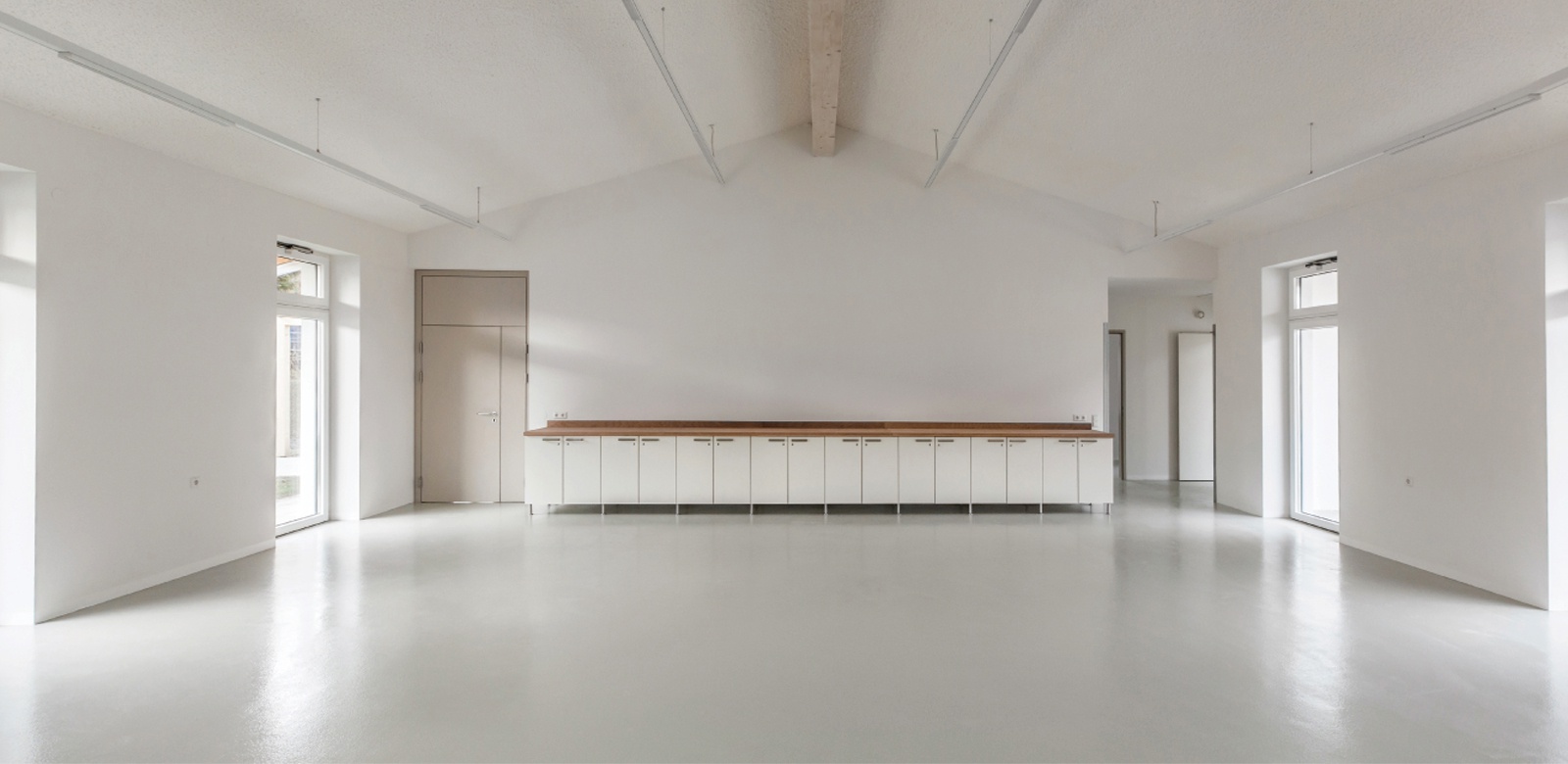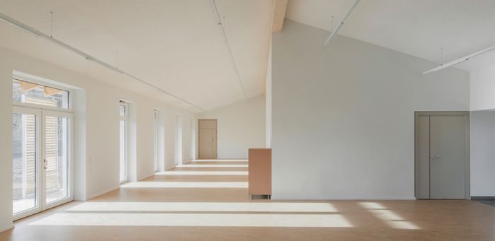 Besonderes Augenmerk wurde gelegt auf die Qualität der Belichtung und Beschattung der Räume; weit auskragende Dachüberstände beschatten die großzügig dimensionierten Fenstertüren, die von Nord und Süd Licht in die bis unters Dach offenen Gruppenräume lassen. Die Räumlichkeiten der Einrichtung sind so konzipiert, dass Menschen mit erhöhtem Unterstützungsbedarf die Möglichkeit haben überall zu arbeiten. [Quelle: www.noe.lebenshilfe.at]