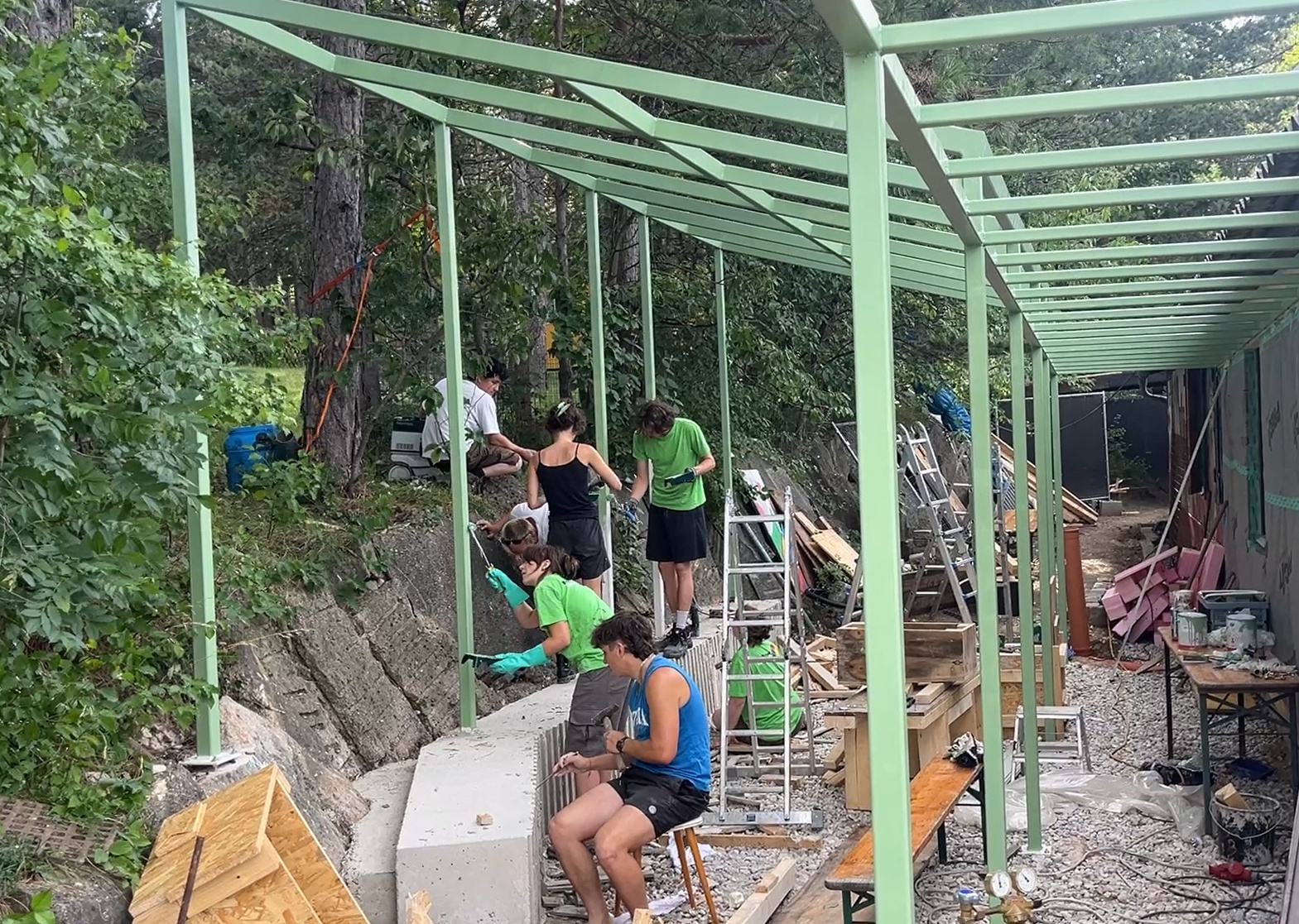 Auch der zuvor ungenutzte südwestliche Außenbereich wurde aktiviert und an den Gemeinschaftsraum angebunden: Eine leichte Stahlkonstruktion mit transluzenter Deckung schafft hier eine wettergeschützte, multifunktionale Freifläche mit Freiluftküche und zusätzlichem Stauraum. Die Freiluftküche und eine großzügig dimensionierte, raumgreifende Sitzbank, die den Außenraum zum angrenzenden Hang hin abschließt, wurden von den Studierenden als monolithische Betonblöcke gegossen und anschließend geschliffen. Die fein bearbeiteten Oberflächen des Ökobetons nehmen in ihrer Anmutung Bezug auf den am Gelände allgegenwärtigen Lindabrunner Konglomeratstein und schlagen damit einen gestalterischen Boden zwischen Ort, Material und Architektur.