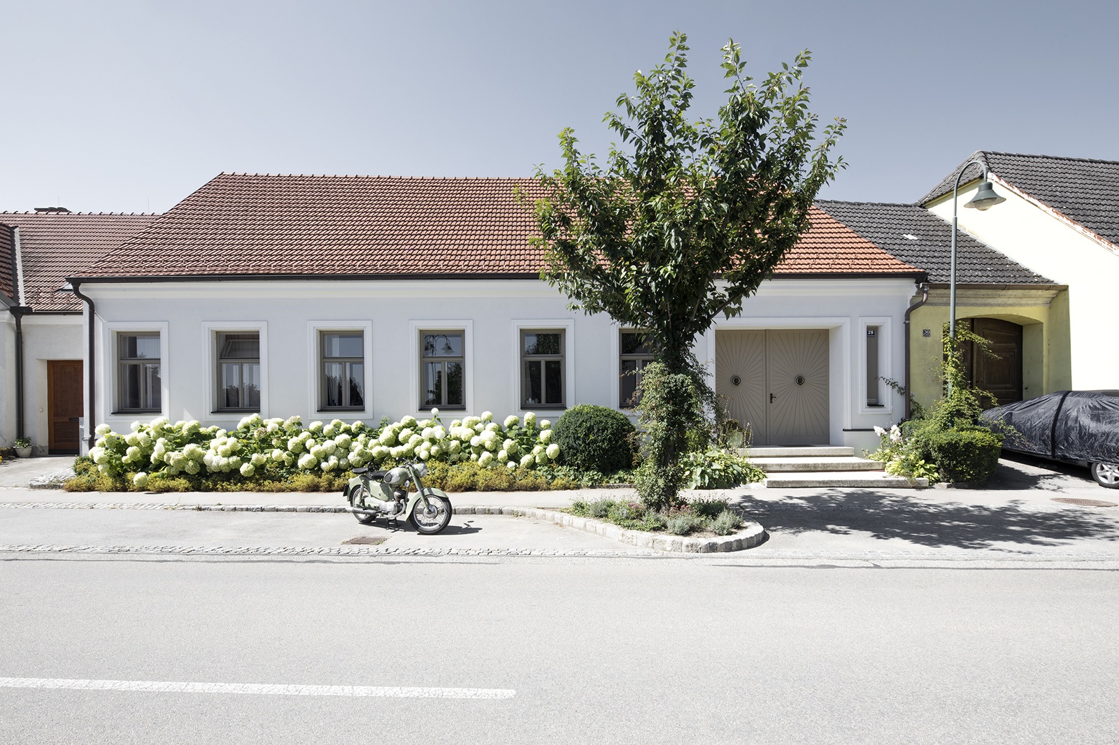Der Neubau zeigt sich wie eine Wand aneinander gereihter Häuser archetypischer Form. Sein Baukörper verbindet qualitätsvolle Innenräume mit hohen Raumvolumen und einer ästhetischen Schlichtheit. Das Material entspricht dem Einsatz und Maßstab örtlich vorgefundener Bauweisen. Die tragenden Wände bestehen aus zweischaligem, teils mit Schuttmaterial gefülltem Mauerwerk aus 25 cm Hochlochziegeln, deren massiver Eindruck durch Faltung ihrer äußeren Wandschicht verstärkt wird und sich gartenseitig großzügig öffnet. Darüber ruht der helle hölzerne Dachstuhl mit Satteldächern.