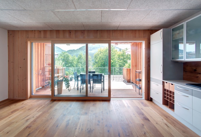 Das Terrassenhaus im Hang ist ein Hybridbau. Alle erdberührenden Bauteile und Decken sind aus recyceltem Beton, das Kellerfundament mit der Tiefgarage, in der de facto nur Fahrräder stehen, ist in den Hang geschoben.
