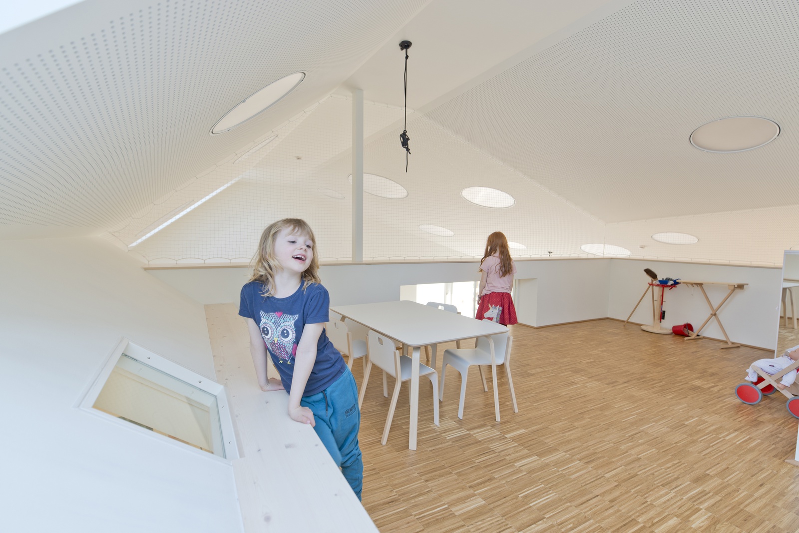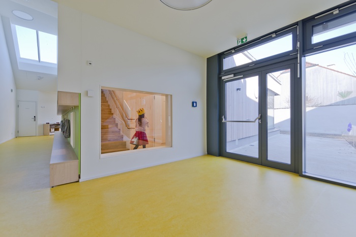 Der Eingang erfolgt straßenseitig von Norden, südseitig angeschlossen befinden sich – perlenschnurartig über eine als Spielstraße und Garderobenbereich gestaltete Gangzone – die einzelnen Gruppenbereiche. Die Gruppenräume haben eine relativ neutrale, dem Quadrat angenäherte Grundform mit großzügiger Raumhöhe und bieten den Kindern eine klare Orientierung. Dem quadratförmigen Großraum für gemeinsame Aktivitäten sind räumlich Podeste, Galerien und Nischen als Kuschel- und Spielecken zugeordnet. Durch flexible Einrichtungsgegenstände können die verschiedensten Spiel- und Aktivitätsbereiche jederzeit definiert und angeordnet werden. Die Verwendung von speziell auf Kinder abgestimmten Elementen (z.B. Fenster auf Augenhöhe, zahlreiche Ein- und Ausblicke) ermöglicht den Kindern ein Interagieren mit der Architektur. So soll es zu einer hohen Identifikation mit dem Gebäude kommen.