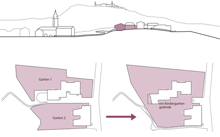 Der neue „Kindergarten-Campus“ in Furth bei Göttweig ist ein zusammenhängendes Ensemble mehrere Bauteile mit einem neuen „Kinder-Platz“ für gemeinsames Spiel und als Treffpunkt in der Mitte. Dieser Platz entstand durch die Verlegung eines öffentlichen Weges, der das Kindergartenareal bisher durchkreuzte. Zusätzlich zur Sanierung und zum Umbau des Bestandes wurde ein Neubau errichtet, der sich als viertes Haus in die Typologie des bestehenden Kindergartens einfügt.