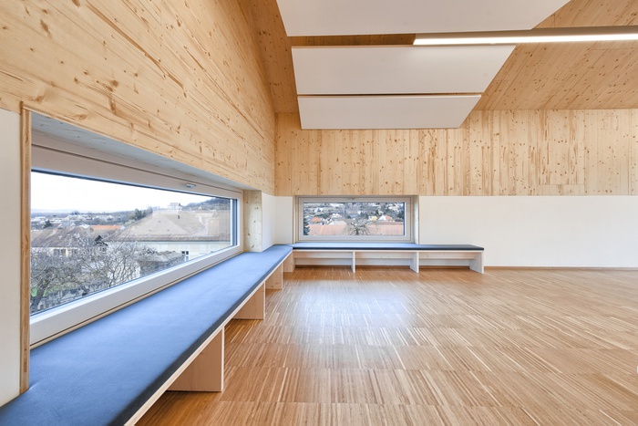 Im Erdgeschoß des Neubaus ist ein Multifunktionsraum integriert, der auch für öffentliche Veranstaltungen der Gemeinde genutzt werden kann. Direkt darüber befinden sich die Räumlichkeiten für eine neue Gruppe mit einer Loggia, welche den Kindern einen herrlichen Ausblick in Richtung Stift Göttweig gewährt und einen zusätzlichen Frei- und Spielraum schafft. Ein Verbindungs-Holzpavillon öffnet sich mit großzügigen Terrassen zum zentralen Kindergartenplatz.