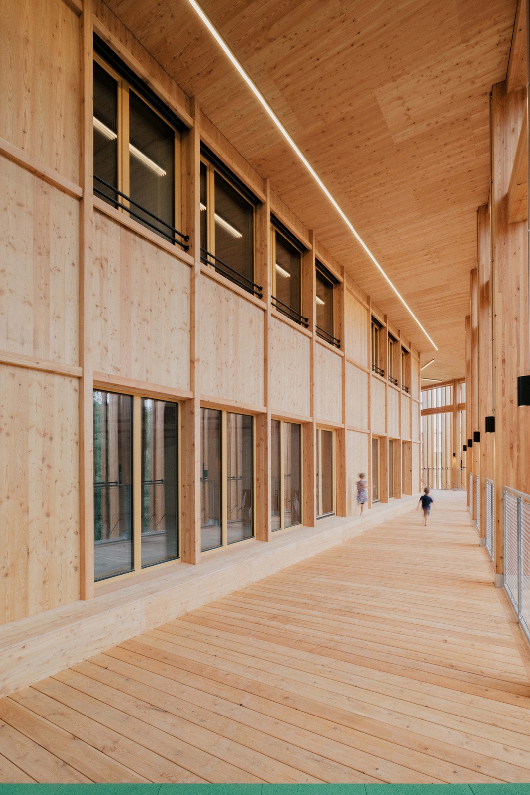 „Erwachsene verlaufen sich immer, Kinder nie“, sagt die künstlerische Leiterin Mona Jas im Entree. Die gestufte Portalöffnung gibt es an allen drei Gebäudeseiten, der umlaufende Sockel fungiert als Sitzbank im Freien. Der Lamellenvorhang der Fassade öffnet das KinderKunstLabor zur Umgebung und sorgt im Inneren für ein bewegtes Licht/Schatten-Spiel. Dass es in diesem Haus auf allen Ebenen um künstlerische Erfahrungsräume geht, ist auch auf der Spielterrasse im 3. Obergeschoss spürbar: Hier können Kinder in Höhe der Baumkronen eine textile Netzlandschaft erklimmen, die die japanische Künstlerin Toshiko Horiuchi MacAdam eigens für diesen Ort geschaffen hat. (Text: Gabriele Kaiser, erschienen in architektur aktuell 11.2024)