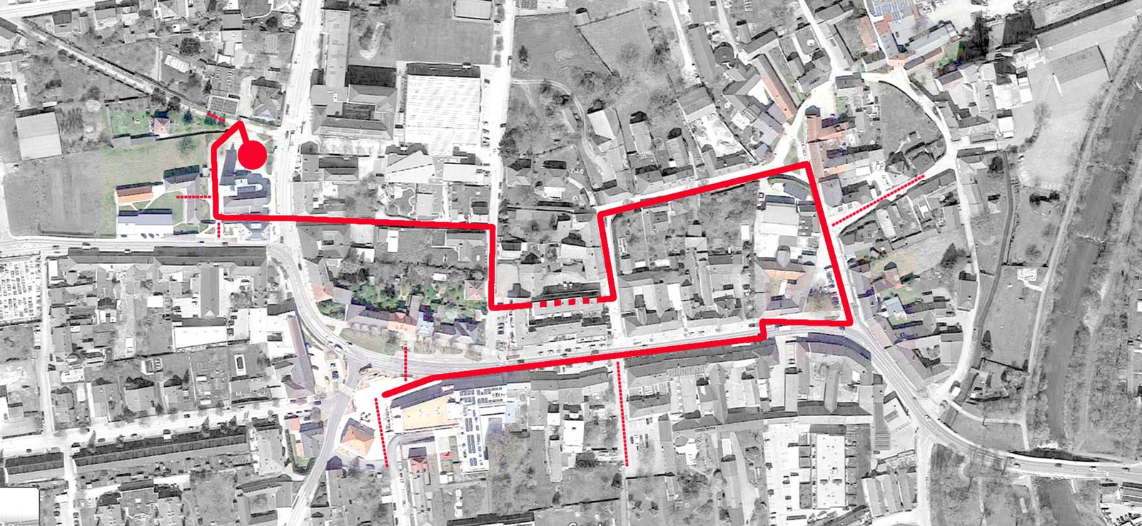 Das Leuchtturmprojekt der Gemeinde stellt der neue Hauptplatz dar (Planung: schumacher.schindl.freiß), bei dessen Errichtung 2021 nicht nur eine dem Ortsmaßstab angepasste Neubebauung errichtet, sondern auch der gesamte öffentliche Raum klimagerecht umstrukturiert wurde. Über einer Tiefgarage entstand ein neues Ortszentrum mit geschäftlich genutzter Erdgeschoßzone und mit darüberliegenden Wohnungen und einem von der Bevölkerung gewünschten Ärztezentrum. Alle Dächer sollten begrünt ausgebildet werden. Um unterschiedliche Funktionen unterzubringen (Bauernmarkt, Treffpunkt, Aufenthalt, Schanigarten u.v.m.), wurde die Hauptstraße verlegt und der Platz vergrößert. Die gepflasterten Platzoberflächen wurden versickerungsfähig und rund um das renovierte gründerzeitliche „Rothaus“, dessen künftige Nutzung noch offen ist, unversiegelt ausgeführt. Das Platzmobiliar umfasst Trinkbrunnen, Pergola, Schattenspender und Sitzbänke. Die Bepflanzung wird von Sträuchern und Beeten gebildet und ergänzt den weitgehend erhaltenen historischen Baumbestand. Auch die Plätze rund um die Kirche und das Gemeindeamt wurden im Zuge der Zentrumsentwicklung erneuert und barrierefrei gestaltet. Die gelungene neue Platzfolge erzeugt eine angenehm ruhige und zurückhaltende Stimmung.