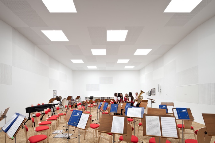 Stadtamt. Um die akustischen Anforderungen der Musiker und die maximalen Förderkriterien des Landes Niederösterreich zu erfüllen, muß der Probenraum eine lichte Raumhöhe von fünf Meter und eine Fläche von Quadratmeter/Musiker aufweisen, durch diese Parameter wurde dessen Volumen definiert.