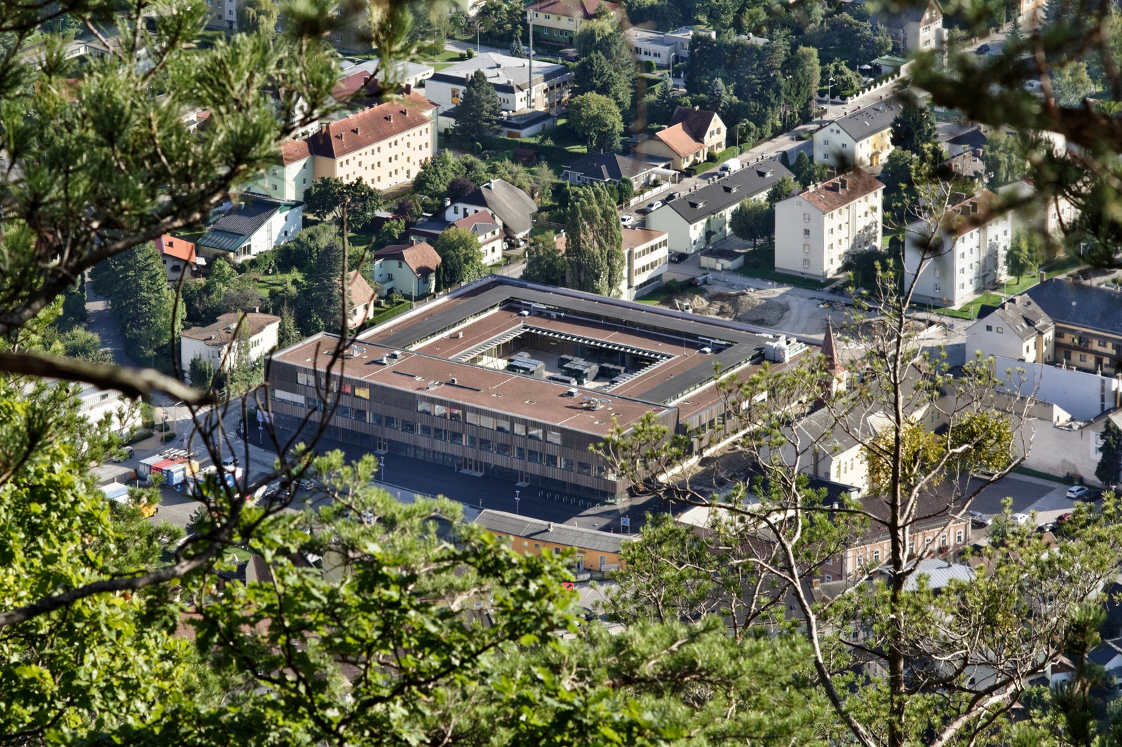 Die niederösterreichische Stadt Gloggnitz kämpft mit Strukturproblemen, denen man auf unterschiedliche Art entgegnet. Beim Hereinfahren in den Ort preist gleich das erste Schild im Kreisverkehr die „Einkaufsstadt Gloggnitz“ an, zugleich wird das Stadtzentrum durch das große neue Schulzentrum dominiert, welches programmatisch Bildung als Zukunft der Stadt hervorhebt. Zwar war bereits zuvor das alte Schulzentrum, bestehend aus Volksschule, Mittelschule und Polytechnikum, an diesem prominenten Standort, doch der Neubau umfasst nicht nur zusätzlich das Sonderpädagogische Zentrum, er ist auch kompakter, was vor allem dem quadratischen Grundriss von ca. 70 auf 70 Meter geschuldet ist. Ein solches Volumen kann als Barriere wirken. Doch das Architekturbüro von Dietmar Feichtinger und die Bürgermeisterin, Irene Gölles, machen plausibel, wie diese gemeinsame bewusste Entscheidung genau das Gegenteil bewirken kann und soll. Die im Wettbewerb geforderte Nachhaltigkeit betraf nicht nur das ökologische Konzept, das mit Wärmepumpe, Massespeicherung und Solarzellen heutigen Standard erfüllt. Vielmehr ging es vor allem darum, die vielfältigen sozialen und pädagogischen Aktivitäten zu einem nachhaltigen Austausch mit der ganzen Stadt zu verbinden. Das geschieht auf mehreren Ebenen. Zum einen bietet das Schulzentrum in den eigenen Räumen die Möglichkeit zur Nutzung durch Sportvereine, Veranstaltungen aller Art usw. Zum anderen ist die Erdgeschosszone konsequent raumhoch verglast, sodass PassantInnen unmittelbar Einblick in die Werkstatt-, Experimentier- und Technikräume haben, die hier untergebracht sind. Vor allem aber werden die zentral gelegenen Sporthallen – eine Turnhalle, eine Kletterwand, ein Gymnastikraum –, auf die man stößt, sobald man das Gebäude betritt, Besuchende visuell und akustisch in ihren Bann ziehen. Wahrscheinlich eine Hommage an Josef Lackners Ursulinengymnasium in Innsbruck (1980), funktioniert die Botschaft hier im Stadtzentrum noch viel besser: spielende, lernende, tobende Kinder sind die beste Investition in die Zukunft. Die „offene Form“ unterstützt auch das dreidimensionale Raumfachwerk aus Stahl, das 30 Meter weit spannt, genauso wie die Clusterung der Klassenräume im ersten Obergeschoss jeweils um einen „Marktplatz“ und diese wiederum um einen großen offenen Hof auf dem Dach, der zudem wunderbare Ausblicke in die Umgebung ermöglicht. Dazu belastbare Materialien wie Fichtenholz für die Innenräume (Lärche im Außenbereich), einfache Holzwolle für die Decke und zahlreiche Durchgänge oder -blicke dürften dem Anliegen der Gemeinde nach vielfältigem Austausch, Inklusion, Diversität und Nachhaltigkeit genau entsprechen. (Text: Angelika Schnell für den ZV-Bauherrenpreis)