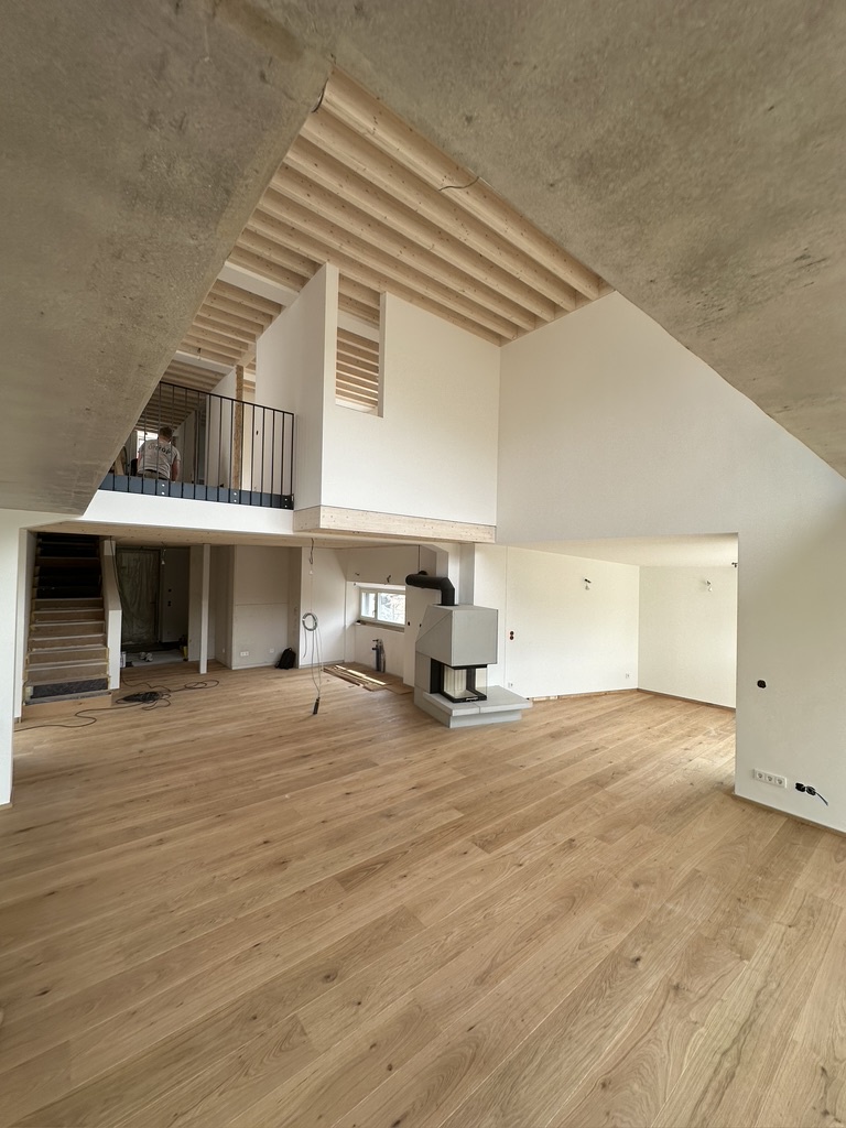 Das Dach wurde zur thermischen Hülle, die dem Raum eine neue Dimension verleiht. Der offene Erdgeschossraum wird von Tageslicht durchflutet und schafft eine Verbindung zur Natur. Der Boden, mit Trittschalldämmung und Parkett ausgestattet, vermittelt Wärme und Behaglichkeit. Die Außenwände, temperiert durch eine Wandheizung, schützen vor Feuchtigkeit und tragen zu einem angenehmen Raumklima bei.