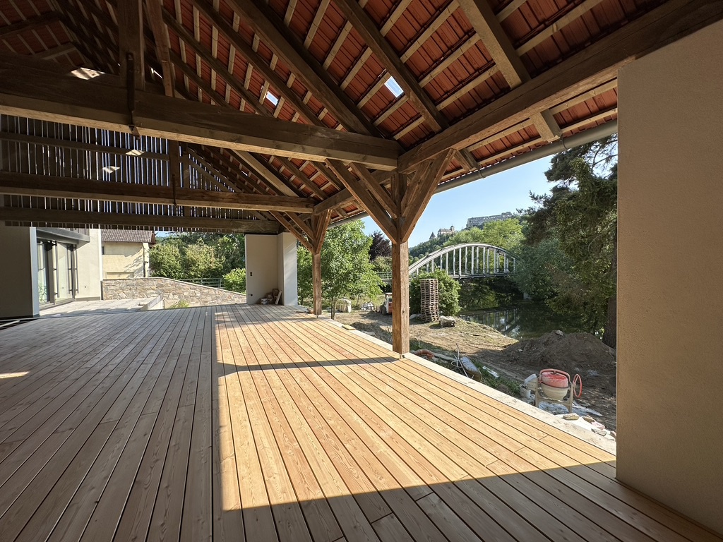 Besonders eindrucksvoll ist die Sanierung des Kutschertrakts. Die ursprüngliche Außenhülle blieb erhalten, doch innen wurde das Haus von Grund auf erneuert: neue Tramdecken, thermische Sanierung, Integration des Dachgeschosses. Dabei entstanden spannende Raumbezüge – zweigeschossige Volumen stehen in Kontrast zu niedrigen Nischen, ein Erker betont die Eigenwilligkeit des Bestands. Eine große Verglasung zur Flussseite und eine Loggia im Dachgeschoss schaffen Verbindung zwischen Innen und Außen.