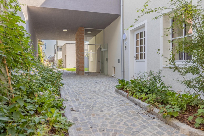 Zwischen dem Bestandsgebäude und der neuen Reihenhausbebauung bildet eine kleine Freifläche den räumlichen Übergang.