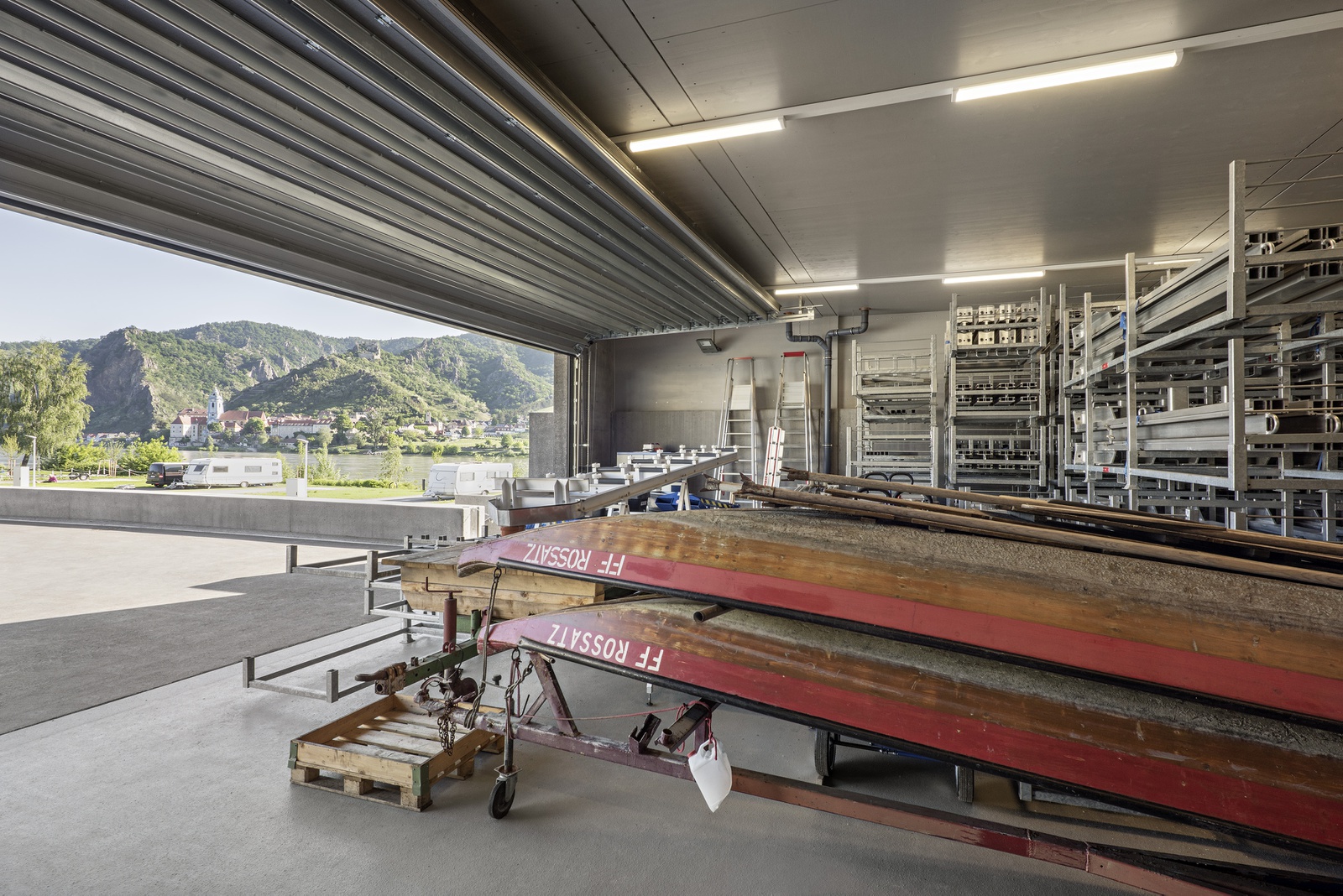 In Rossatzbach, dem größten und zugleich touristischsten Ortsteil innerhalb des Projekts, wurden der Treppelweg, die Festwiese und der Campingplatz neugestaltet. Da der Neubau des Motorbootclubgebäudes und des Mobilelementelagers auf den äußerst beengten Platzverhältnissen untergebracht werden musste, wurde ein Gebäude entwickelt, das diese Funktionen synergetisch unter einem Dach vereint. Eine weitere Synergie wurde mit der Hochwasserschutzmauer erzielt, die fast die Hälfte der Gebäudehülle bildet, womit Ressourcen eingespart werden konnten.