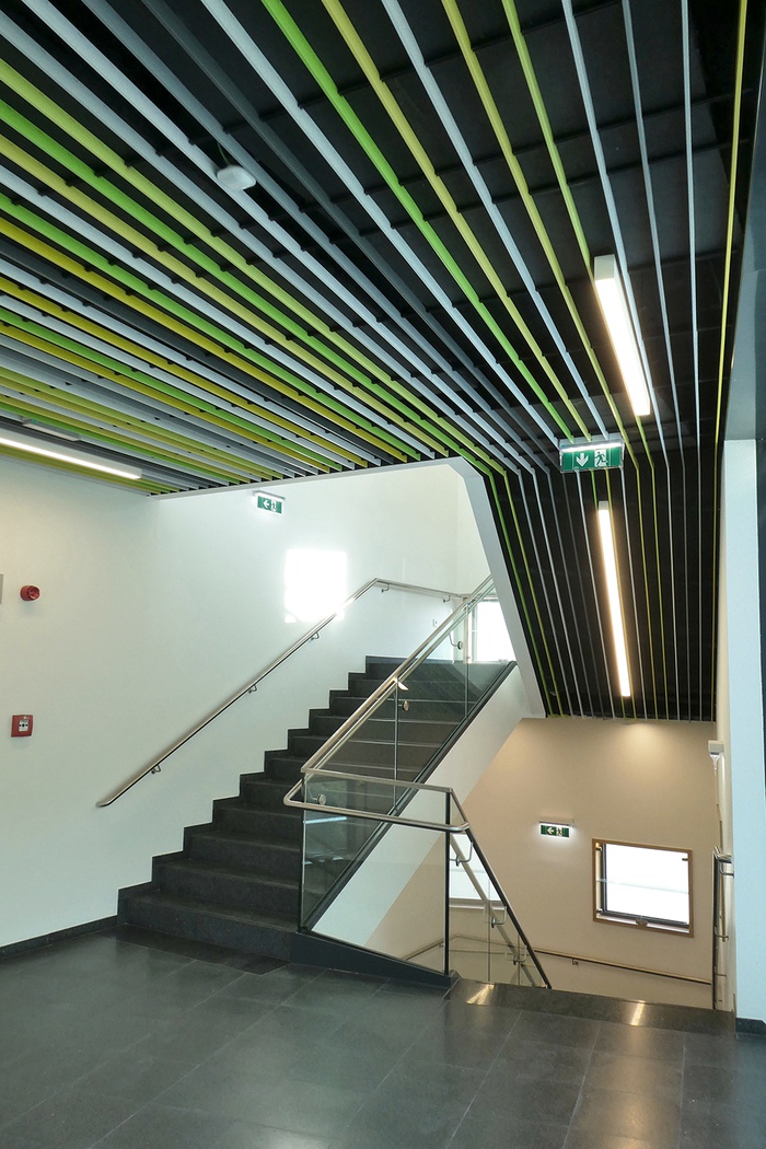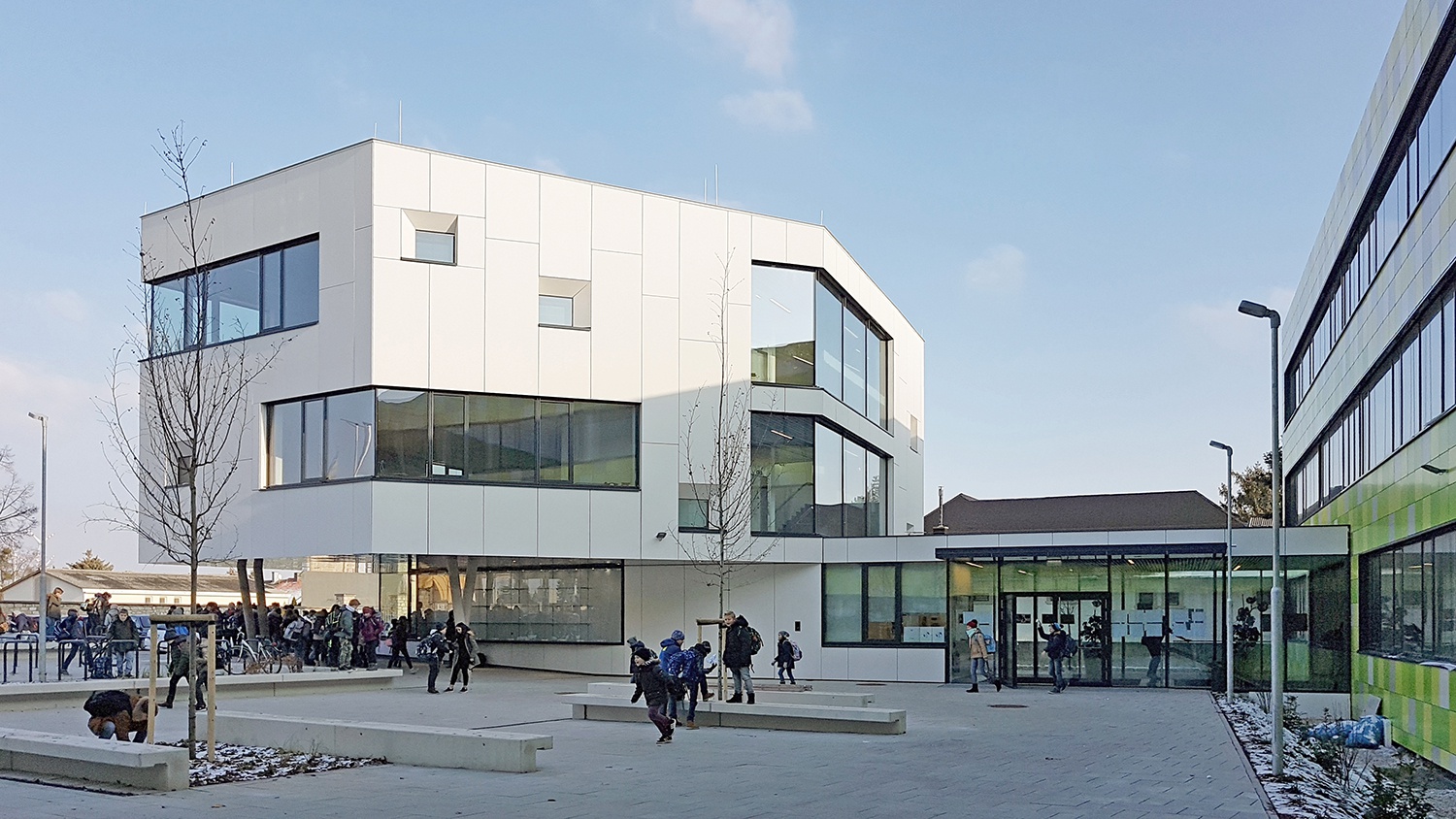 Um den wachsenden Raumbedarf zu decken, bietet der neue Kreativturm auf 650 m2, verteilt auf drei Ebenen, moderne Unterrichtsräume für Technisches und Textiles Werken sowie Bildnerische Erziehung. Der Neubau ist ein inspirierender Ort für Kreativität und Kommunikation und versteht sich als gebaute Pädagogik. Der Neubau wurde in Niedrigstenergiebauweise als Stahlbetonkonstruktion ausgeführt. Die zentrale, CO2-gesteuerte Lüftungsanlage mit Wärmerückgewinnung sorgt für besten Komfort in den Klassenräumen. Ein außenliegender Sonnenschutz vermeidet sommerliche Überhitzung und lenkt mittels Beschichtung der Lamellen diffuses Licht bis tief in die Räume. Großzügige Verglasungen an der Fassade erzeugen Aufmerksamkeit und kleine quadratische Fassadenöffnungen, sogenannte “Setzkästen”, dienen als Inspiration für kreative Tätigkeiten. So ist es den SchülerInnen ermöglicht, ihre Arbeiten an der Fassade der Öffentlichkeit zu präsentieren und das Erscheinungsbild ihres Schulgebäudes mitzugestalten. Im Inneren sind die Begegnungszonen als Orte der Kommunikation mit zahlreichen Sitz- und Kommunikationsflächen ausgestattet.