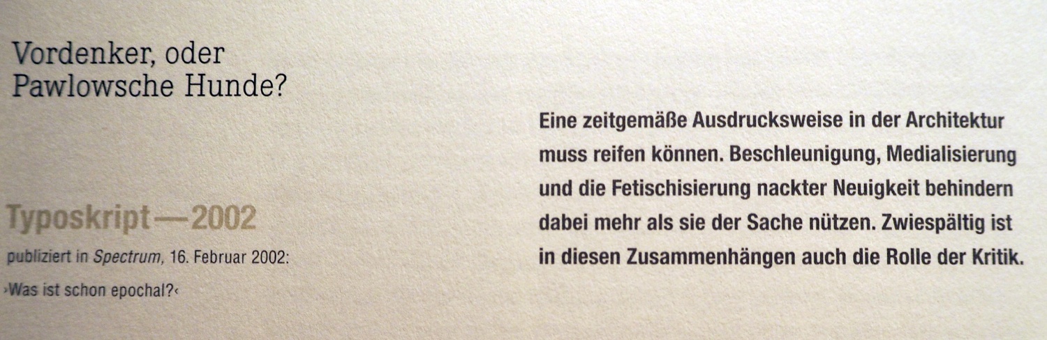 Der Publizist Hubertus Adam hat 2015 im Schweizer Architekturmuseum in Basel eine Ausstellung mit dem Titel „Textbau. Schweizer Architektur zur Diskussion“ kuratiert und die Architekturkritik ins Zentrum der Betrachtung gestellt. Im Katalog zur Ausstellung hat er internationale Architekturkritikerinnen und -kritiker – viele aus dem deutschen Sprachraum – befragt, worin die Essenz von Architekturkritik liegt und wie sie deren Zukunft einschätzen. Es ist bezeichnend, ja eigentlich beschämend, dass sich kein einziger Vertreter aus Österreich unter den Befragten befand.