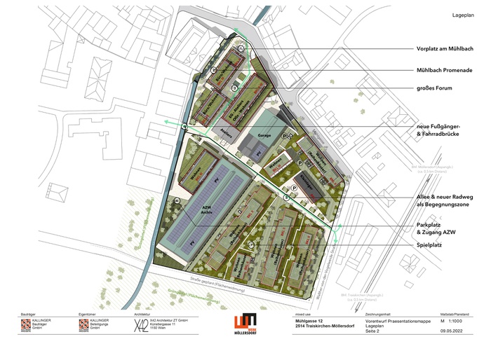 Das Umnutzungskonzept „WERK MÖLLERSDORF“ strebt einen attraktiven Stadtteil mit gemischt genutzten Flächen an, der durch gezielte städtebauliche Eingriffe das nahegelegene lokale Ortszentrum beleben und aufwerten soll. Zwei gestalterisch anspruchsvolle Hallen bleiben erhalten. Die übrige Bebauung wird durch teils aufgestockte, teils neu errichtete Gebäude ersetzt bzw. ergänzt. Die Neustrukturierung schreibt das lineare Grundmuster der Bestandsbebauung durch in der Höhe moderat gestaffelte und mit rundumlaufenden Freiräumen ausgestattete Wohnzeilen fort. Mit Hilfe von differenzierten Grundrissen und Größen strebt das Wohnungsangebot eine durchmischte Bewohner:innenschaft an. Fassadenberankungen, Dachbegrünungen und Photovoltaikanlagen auf den Bestandshallen sowie Erdwärmenutzung gewährleisten ein klimagerechtes und ökologisch verträgliches Projekt mit einer neutralen CO2-Gesamtbilanz. Die Freiräume sollen weitgehend entsiegelt werden. Neue Wege und Brücken über den Mühlbach - auch für Radfahrer:innen - und die Vergrößerung der bestehenden Freiflächen sollen das Areal künftig zu den Nachbarschaften in alle Richtungen öffnen. Gemischtgenutzte Gebäude sollen ein lebendiges Milieu generieren, das als Ergänzung zu den bestehenden Angeboten der Umgebung (Fleischer, Bäcker, Gastwirt) den Ortskern sozioökonomisch aufwertet und neue Arbeitsplätze schafft: Geschäfte, Museum und Depot sowie, zum Teil auch in den Obergeschoßen, Raumangebote für Dienstleistungen. Durch den Erhalt der historischen Giebelwände und die Rückstaffelung der Kubaturen an der Mühlgasse respektiert das Projekt den Maßstab der Umgebung. Die für den Stadtteil wohl attraktivste Maßnahme stellt die Öffnung des Mühlbaches an der Mühlgasse dar, der an dieser Stelle eine neue Brücke erhält und gemeinsam mit einem neuen Vorplatz künftig zum Treffpunkt, Aufenthalts- und Identifikationsort werden kann.